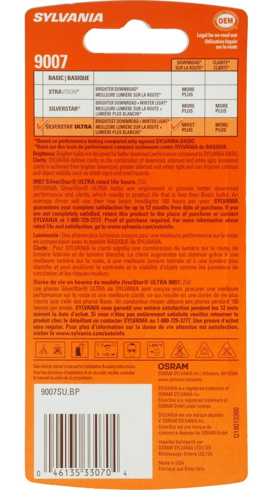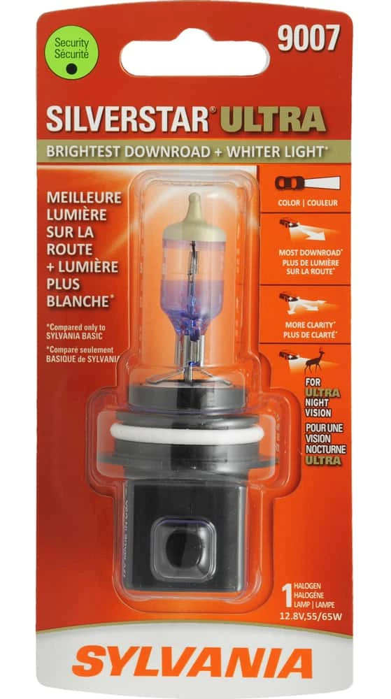 The SYLVANIA 9007 SilverStarĀ® ULTRA High Performance halogen headlight is Sylvania’s brightest downroad replacement bulb, offering whiter light and greater clarity.