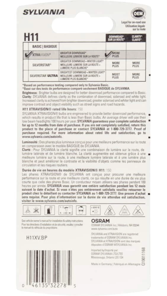 - Sylvania H11 XtraVision® Halogen Headlight Bulbs give you more down-road visibility through superior design and a proprietary halogen gas mixture