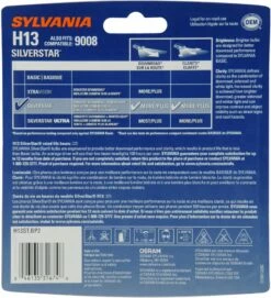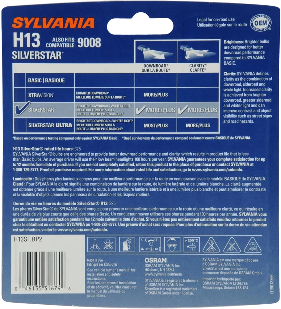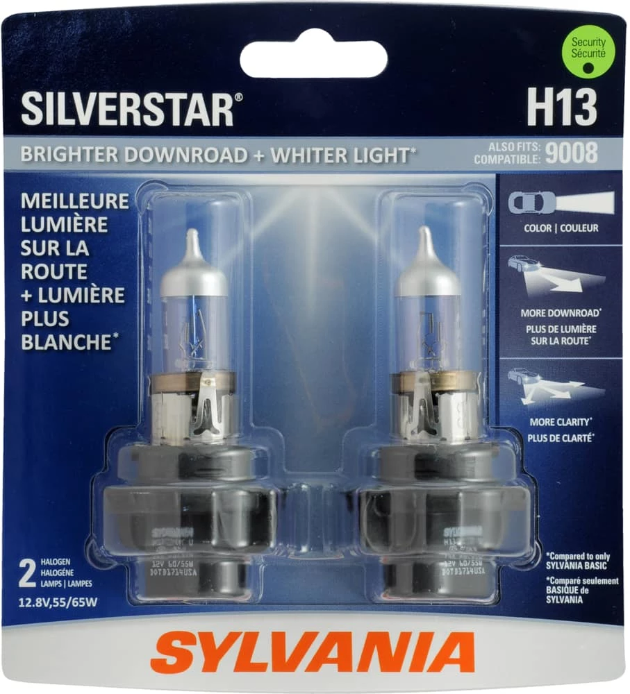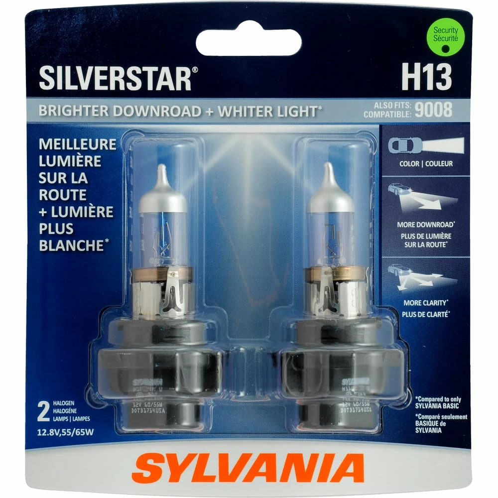 The SYLVANIA H13 SilverStar® High Performance halogen headlight delivers a brighter and whiter light enhancing your overall experience when driving at night.