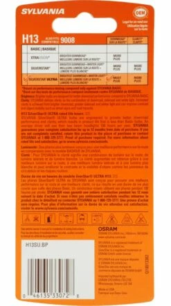 The SYLVANIA H13 SilverStarĀ® ULTRA High Performance halogen headlight is Sylvania’s brightest downroad replacement bulb, offering whiter light and greater clarity.